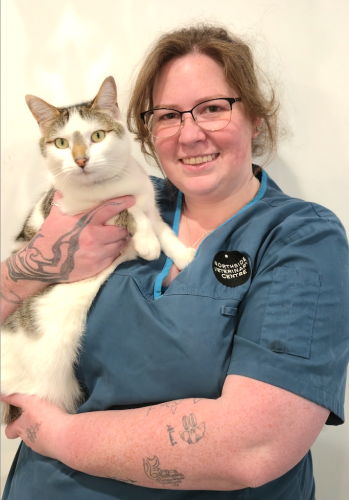 Clelia joinedthe NVC team in November 2022. At work she most enjoys clinical nursing including monitoring and treating our hospitalised patients. Clelia enjoys working with all furry friends but she especially loves cats. In her free time Clelia likes reading and hiking in nature reserves. Clelia lives with her partner and their much loved cats Koda and Evie.